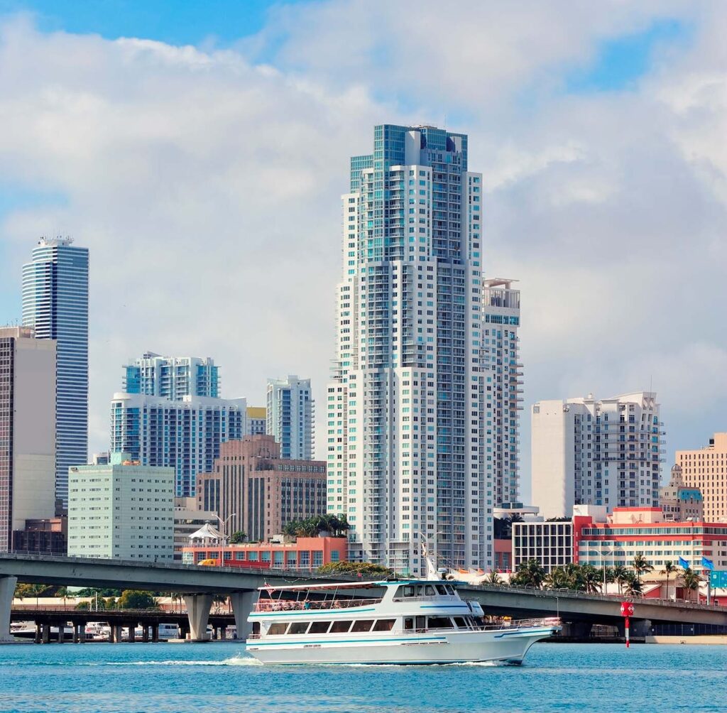 An impressive 45-story glass tower surrounded by glass railings offers panoramic views of Biscayne Bay, the Miami River, and the city skyline.